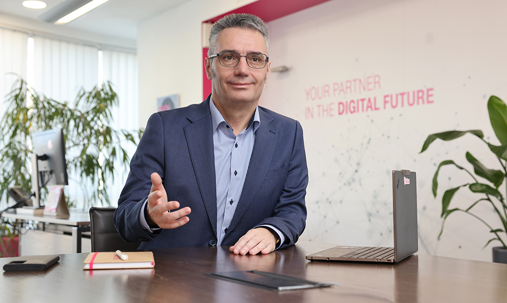М. Богатиновски: Ги следиме сите нови текови кои доаѓаат од Групацијата Дојче Телеком, но креираме и сопствени уникатни решенија. Примената на вештачката интелигенција, секако, е на врвот од нашите приоритети, особено преку говорни ботови кои водат конверзација и му помагаат на корисникот на македонски јазик, како што тоа го имплементираат колегите од Унгарски Телеком на унгарски јазик. Комуникацијата преку 5 Г-мрежата ќе биде клучна не само за телемедицината туку и за автоматизација на производствените ленти, што веќе наоѓа примена во чешките фабрики од автомобилската индустрија. Ја прошируваме работата на Безбедносниот оперативен центар кој ќе нуди проширени сајбер безбедносни услуги 24/7. Ги надополнуваме паметните решенија со нови вградливи сензори на IoT, односно интернет на нештата (анг. Internеt of Things) уредите и на нашата платформа.