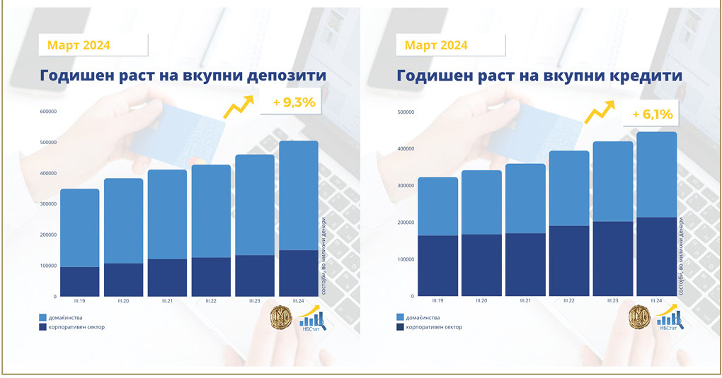 Анализирано на годишно ниво, вкупните депозити се зголемени за 9,3%, поради повисоките депозити на двата сектора, со поголем придонес на секторот домаќинства.