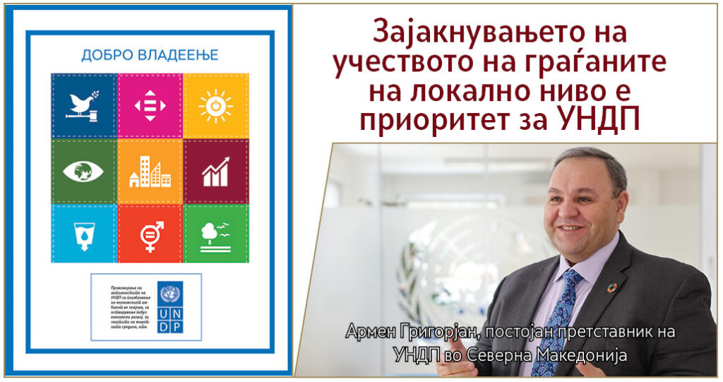 А. Григорјан: Агендата 2030, со фокус на инклузивноста, на транспарентноста и на отчетноста, е усогласена со мисијата на УНДП за зајакнување на локалното управување, на владеењето на правото и на учеството на граѓаните. Како што земјата се движи кон членство во ЕУ, усогласувањето со одредбите во ЕУ, владеењето на правото и стандардите за човекови права се од врвен приоритет. УНДП го поддржува овој процес преку подобрување на структурите на управување, промовирање дигитални јавни услуги и зајакнување на учеството на граѓаните во локалната власт.