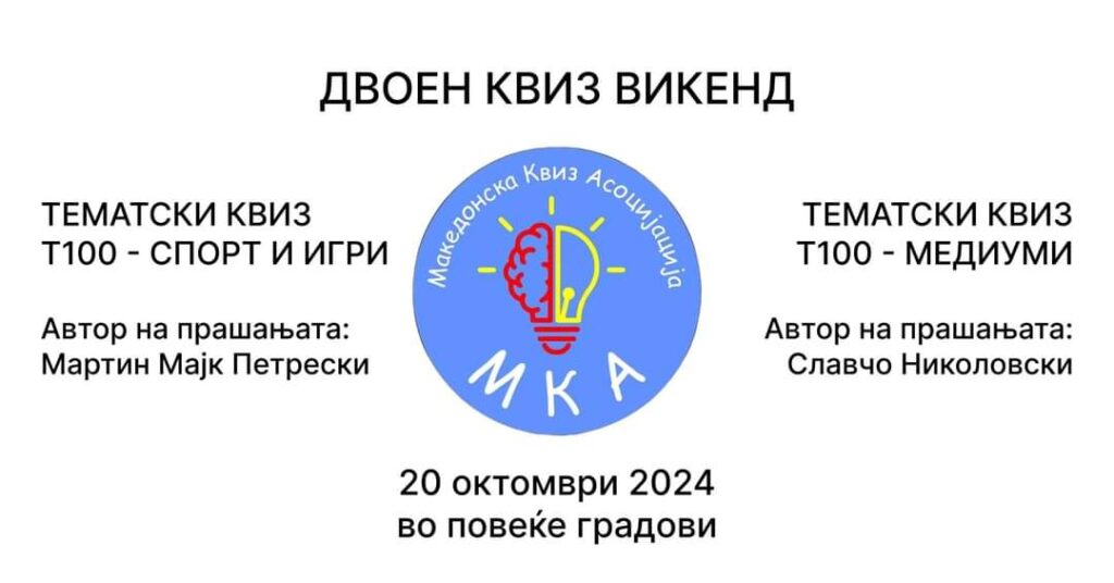Македонската квиз асоцијација на 20 октомври во повеќе градови низ Македонија ќе ги одржи првите два тематски квизови – спорт и игри, и медиуми. Секој од двата квиза се состои од 100 прашања, а времето за решавање за секој од нив е еден час. На квизот на тема спорт и игри можете да најдете прашања од најразлични спортови, игри, хобија, рекорди и достигнувања, додека на квизот на тема медиуми ќе се најдат прашања од филмот и литературата, прашања за стрипови и графички новели, но и за јазиците.