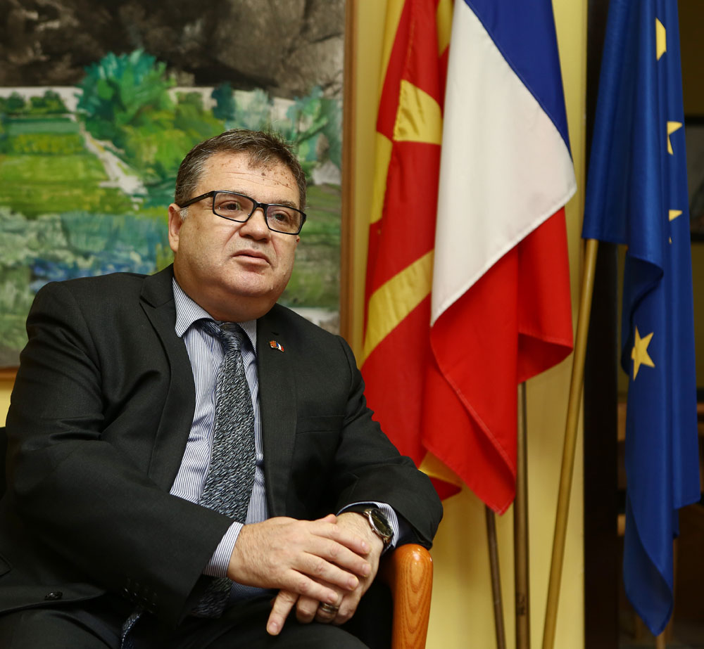 Н.Е. К. Тимоние: Изработката на физибилити студија за изградба на пречистителна станица за вода за градот Скопје е навистина од примарна важност. Очекуваме наесен да се одржи меѓународна донаторска конференција за да се обезбеди финансиската платформа. Франција е особено заинтересирана за можностите што ги нуди одржливиот развој на Македонија, со нејзините перспективи во земјоделството, но исто така и третманот на отпадот, потоа транспортот, работите од јавен карактер и туризмот, како голем неискористен потенцијал кој бара материјални и човечки инвестиции преку почитување на животната средина. По Самитот во Париз за Балканот во 2016 година, Франција го засили своето дејствување во однос на регионалното финансирање: Македонија треба да го искористи овој момент дотолку повеќе што новите власти јасно изразија желба да се продлабочат нашите размени. Здружението на француски компании МЕДЕФ (MEDEF) веднаш по формирањето на Владата на господинот Заев изрази желба да го прими новиот премиер за тој да се запознае со француската бизнис-заедница. Продолжение несомнено ќе има, а веќе неколку големи француски компании покажаа нов интерес за земјата очекувајќи резултати од новиот елан што го најавува македонската Влада. Нејзините ветувања во поглед на транспарентноста и на ефикасноста, како и напредокот во борбата против практиките кои се во спротивност со законот се забележани и високо оценети. Имав можност да зборувам во повеќе наврати со заменик-претседателот на Владата, господинот Анѓушев, кој во Трст се сретна со нашиот министер за економија. Има одличен потенцијал за продлабочување на размените. Наесен приоритет на Амбасадата ќе биде да го следи движењето на нашите компании.