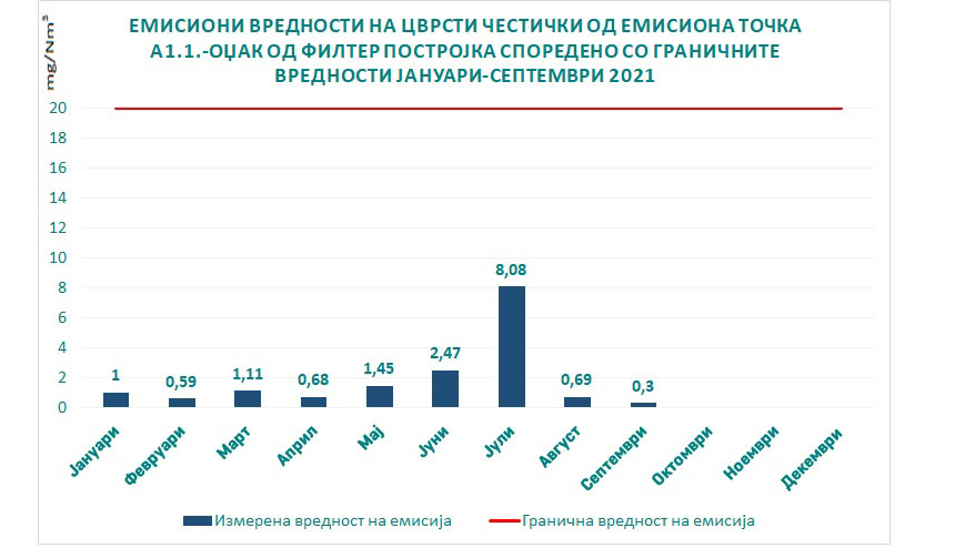 На мерната точка „Оџак на Пескара“ каде граничната емисиона вредност е 30 mg/Nm3 во овој период најниска вредност е измерена во јануари 0,32 mg/Nm3,а највисока во август со измерени вредности од 3,39 mg/Nm3. На втората контролна точка „Оџак од филтер постројка“ најниската измерена вредност е во септември и изнесува 0,3 mg/Nm3, а највисоката во јули и изнесува 8,08 mg/Nm3. На оваа мерна точка пропишаната граничната емисиона вредност е 20 mg/Nm3.