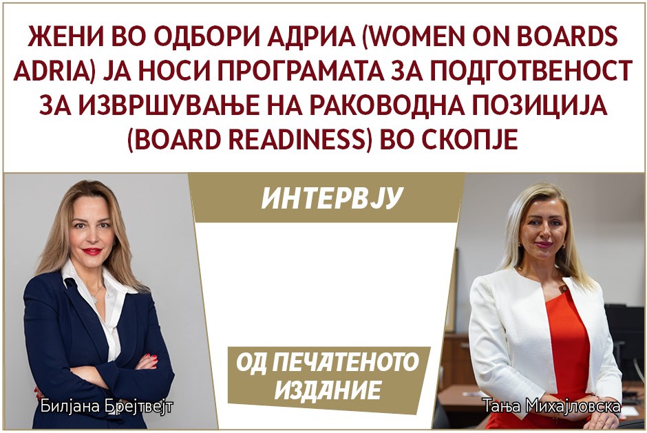 Б. Брејтвејт: Програмата ја изградивме со три столба на учење: истражување (лидерски идентитет и индустриски контекст), консолидирање (стратегија за личен развој) и поврзување (изградба на професионална мрежа со ментори и со колеги). По Сараево, одлуката да ја донесеме втората обука за подготвеност за извршување на раководна позиција во Скопје не беше случаен избор: тука има силен женски потенцијал, но премногу често останува невидлив во управните и во надзорните одбори. На крајот на програмата, учесниците не само што ќе разберат како функционираат одборите туку ќе имаат и вештини и контакти кои треба сериозно да се земат предвид. Би им предложила на сите заинтересирани да ја посетат веб-страницата на Вумен он бордс Адрија за повеќе информации и да аплицираат.