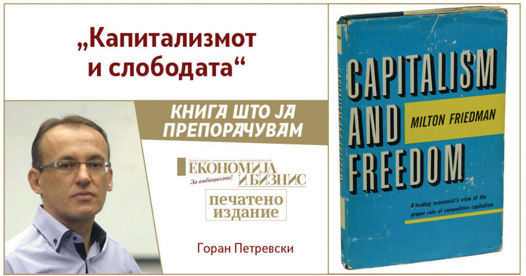 Сепак, во оваа прилика ќе ја препорачам книгата „Капитализмот и слободата“ (Capitalism and Freedom) на големиот економист Милтон Фридман. Не, не сакам да ве исплашам: не се работи за научно дело од кое ќе ве заболи главата, туку станува збор за популарна книга која е лесна за читање, а нуди скапоцени идеи. Верувам дека, штом ја прочитате оваа книга, сосема поинаку ќе гледате на улогата на државата (владата) во економијата и на односот меѓу поединецот и државата.