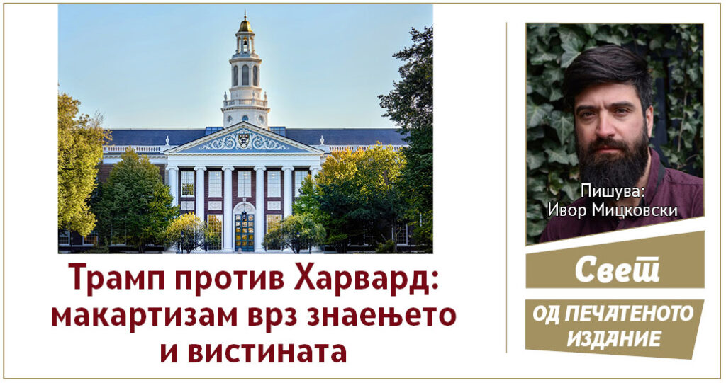 Забраната за странски студенти да се запишуваат на Харвард, па дури и да се бркаат оние веќе запишаните кои може да бидат депортирани од земјата, отвора една сосема нова и драматична страница во оваа културна војна против академијата, елитите и знаењето. Ова веќе и во праксата и во теоријата наликува на макартизам, односно на еден параноичен национализам кој денеска владее со Америка. Но, вреди да се потсетиме дека сенаторот Макарти беше само претседател на една парламентарна комисија, додека Трамп е претседател на САД.