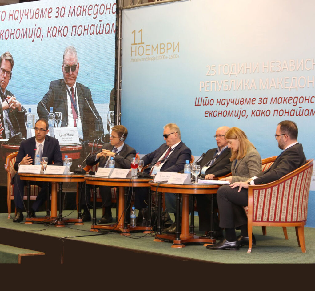 На панелот 1 имаше динамична дискусија за тоа какви економски политики ѝ се потребни на Република Македонија за наредните 25 години. Модераторот Глигор Бишев издвои 4 теми како стожерни точки за дискусија, за кои дебатираа гувернерот Димитар Богов и професорите Александар Стојков, Никица Мојсоска Блажевски и Марјан Петрески. Едно од клучните прашања што се провлекуваше низ дискусиите беше потребата да се предвиди какви професионални профили ќе се бараат во иднина и како за тие потреби соодветно да се адаптира системот за образование во Република Македонија.