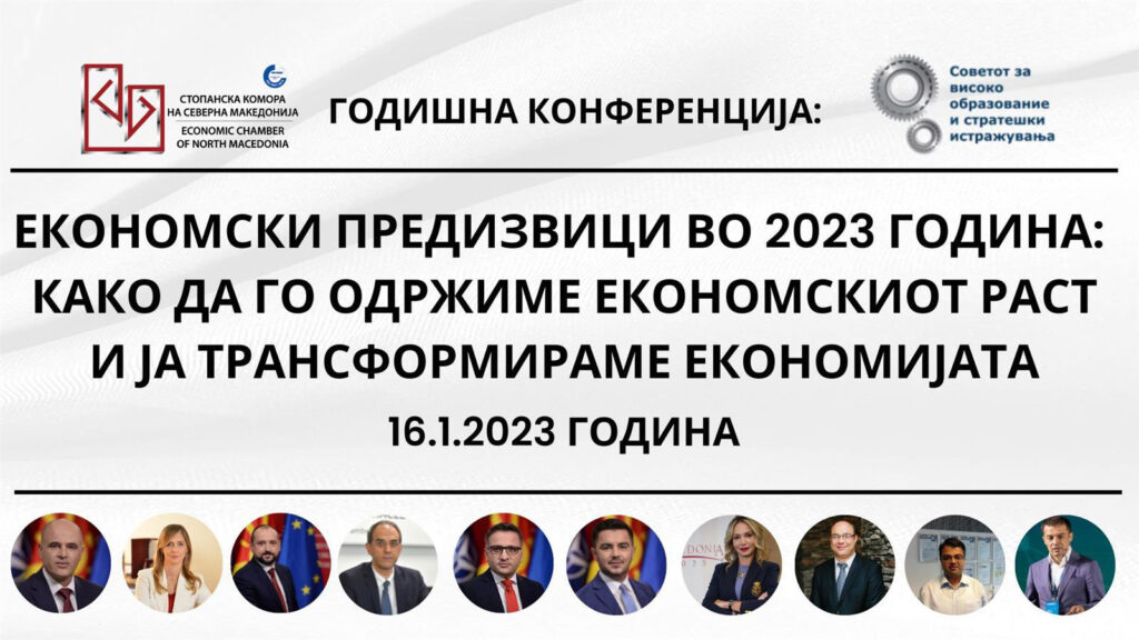 За оваа година, Советот за унапредување на високото образование и стратешки истражувања во рамки на Стопанската комора на Северна Македонија организира конференција со наслов: „Економски предизвици во 2023 година: како да го одржиме економскиот раст и ја трансформираме економијата“. Истата ќе се одржи на 16 јануари 2023 година (понеделник) со почеток од 10:00 часот во Хотел „Александар Палас“ – Скопје.