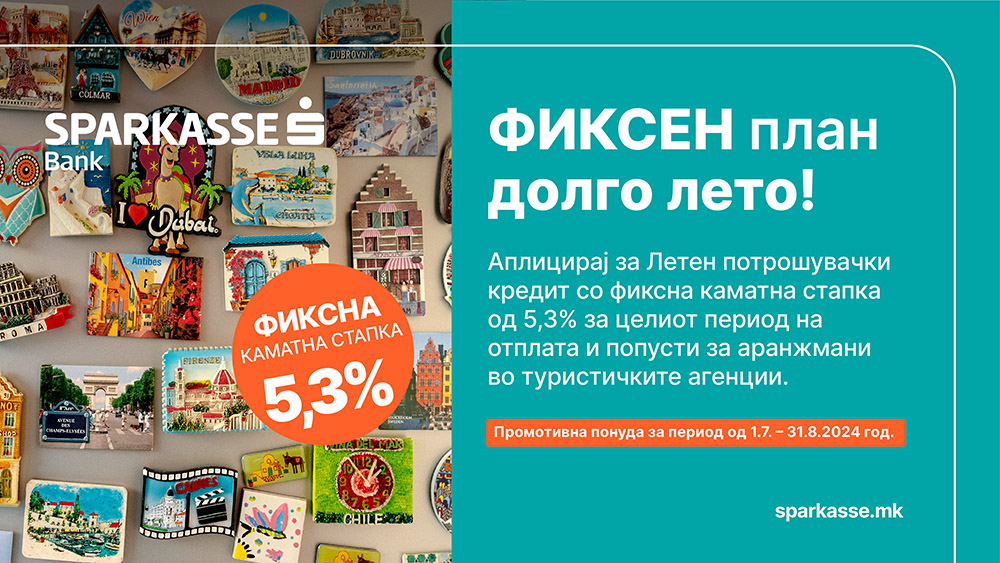 Новиот Летен потрошувачки кредит наменет за патување, со фиксна каматна стапка за целиот период од 5,3%, максимален износ до 180.000 денари и рок на отплата до 48 месеци, е активен од 1.7.2024 до 31.8.2024 година и е со вклучена полиса за животно/неживотно осигурување.