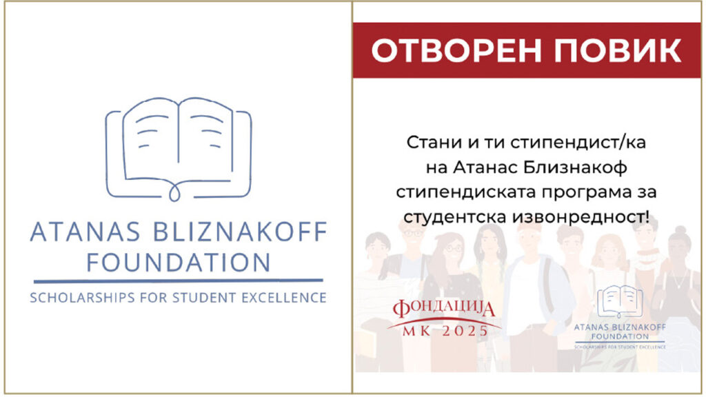 Македонија 2025 и Фондацијата „Атанас Близнакоф“ од САД распишаа отворен повик за доделување на 40 (четириесет) стипендии за талентирани студенти „Атанас Близнакоф„ за учебната 2023/2024 година.