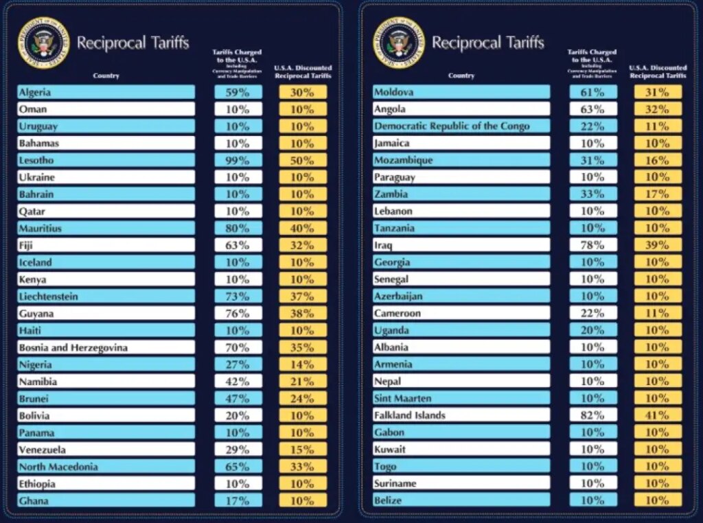 Во соседна колона се прикажани новите царински стапки што САД ќе ги наметнат на секоја земја или територија, вклучувајќи ја и Европската Унија. Реципрочните стапки не се нужно единствените царини на САД со кои ќе се соочат овие земји.