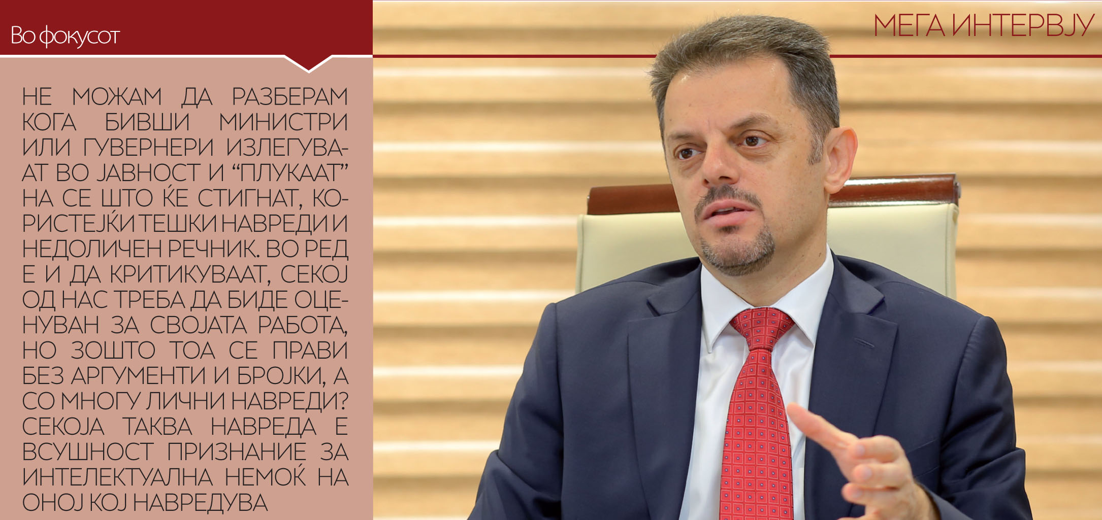 Точно е дека Министерството за финансии е исклучително важно министерство, но и тешко за водење. Во животот имам работено на многу места и извршувано многу значајни функции, вклучително директор за истражување во Народна банка, советник на извршниот директор во Бордот на Светска банка и главен економист во Секторот за развојни политики во Светска банка, значи висококонкурентни и одговорни места, но сепак Министерството за финансии е и најголем и најтежок предизвик во мојата кариера. Тоа се должи на комплексноста и важноста на Министерството кое буквално е вклучено во сите реформи и проекти во државава, но и на тешките времиња што ги донесе светската финансиска криза. Сепак, со огромен труд, знаење и посветеност, заедно со моите одлични соработници и преку тимска работа на многу одлични професионалци, успеавме да ги решиме сите предизвици и да обезбедиме стабилни макроекономски услови и навремена исплата на сите обврски кон фирмите, земјоделците, социјалците, вработените во јавниот сектор. Горд сум што како Министерство и Влада успеавме да ја извлечеме Македонија од кризата со најмали можни последици за граѓаните и стопанството и да оствариме позитивни резултати во економијата. Уверен сум дека и мнозинството граѓани и стопанственици на таков начин ја гледаат и вреднуваат нашата работа, иако секако има и поинакви аспекти и мислења.