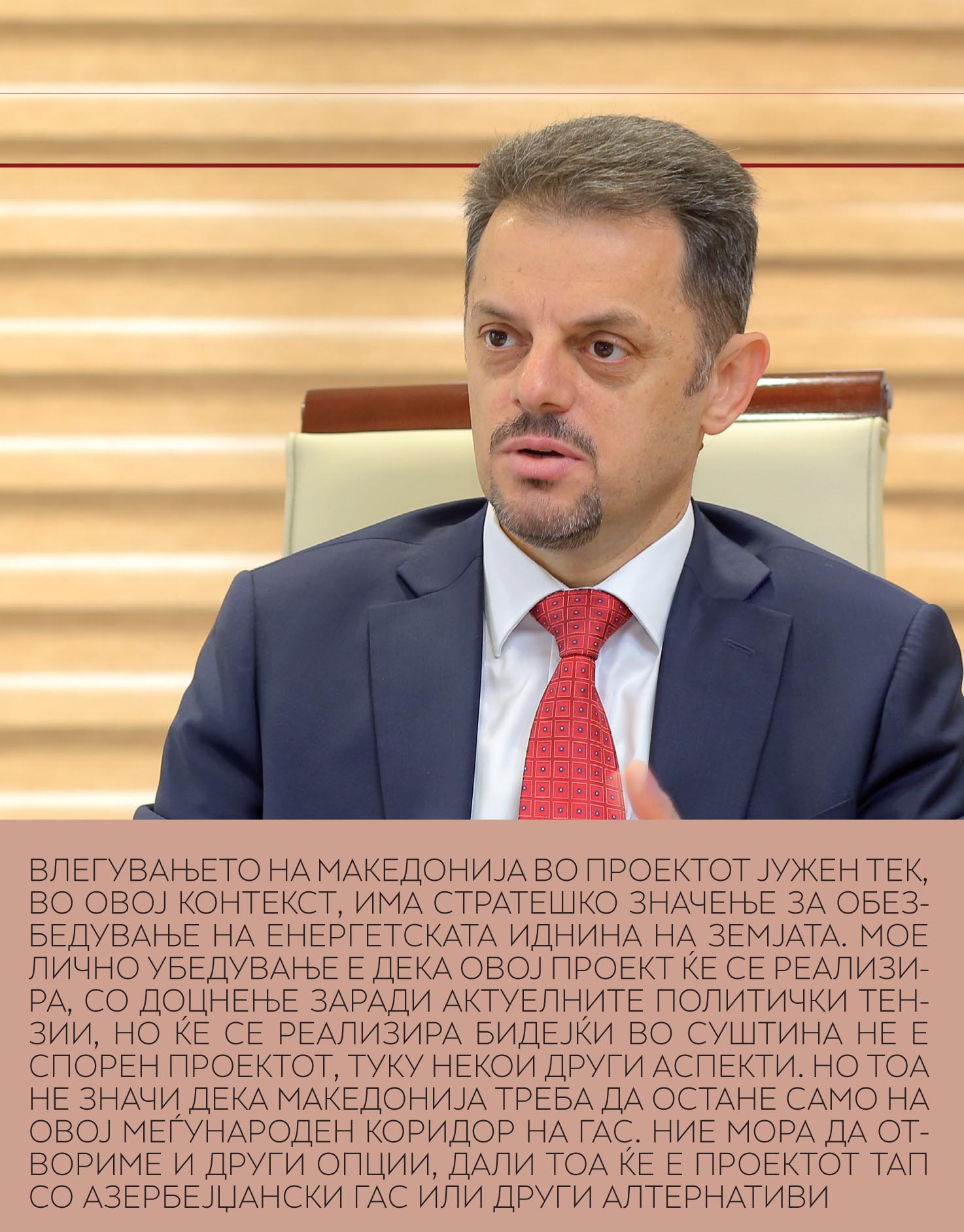 Гасификацијата е врвен приоритет за Македонија со цел да се подигне конкурентноста на стопанството и да се обезбеди пристап до еколошки чист енергенс за домаќинствата. Влегувањето на Македонија во проектот Јужен тек, во овој контекст, има стратешко значење за обезбедување на енергетската иднина на земјава. Мое лично убедување е дека овој проект ќе се реализира со доцнење поради актуелните политички тензии, но ќе се реализира бидејќи во суштина не е спорен проектот, туку некои други аспекти. За нас е значајно дека кога и да се гради, ние ќе сме дел од тоа бидејќи потпишавме договор и со тоа обезбедивме еден значаен извор на гас. Но, тоа не значи дека Македонија треба да остане само на овој меѓународен коридор на гас. Ние мора да отвориме и други опции, без разлика дали тоа ќе е проектот ТАП со азербејџански гас или други алтернативи. Важно е да имаме повеќе алтернативи и да не сме зависни од поединечен извор на гас, односно од поединечна земја. Тоа е стратегијата на Владата и убеден сум дека со отворените разговори одиме во добра насока за обезбедување на повеќе алтернативни пристапи.