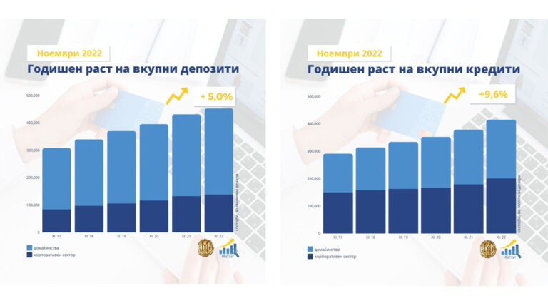 Годишен раст од 5,0% на вкупните депозити и од 9,6% на вкупната кредитна поддршка во ноември 2022 година. На годишна основа, вкупните депозити бележат раст од 5,0%, при зголемување на