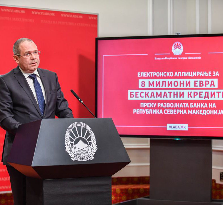 Од среда, 29-ти април микро, малите и средни компании од сите дејности, погодени од КОВИД-19 кризата, ќе можат да аплицираат за 8 милиони евра бескаматни кредити, преку Развојната банка на Северна Македонија. Кредитите од оваа линија ќе бидат до 90.000 евра, а условите и постапката за аплицирање се олеснети. На јавната презентација на новата бескаматна линија, која е антикризна мерка за справување со коронакризата, присуствуваа министерката за финансии Нина Ангеловска, директорот на Развојната банка, Кире Наумов, директорката на Централниот регистар Марија Бошковска Јанковски и преку видео изјава амбасадорката на Јапонија во земјава, Кеико Ханеда.