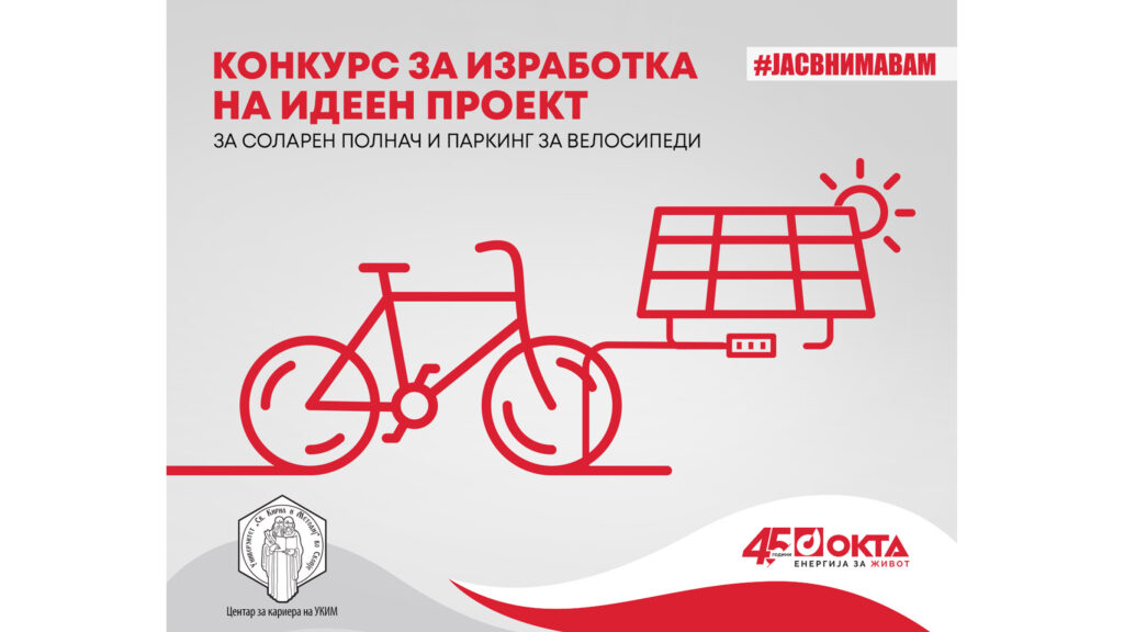 По повод 45-годишен јубилеј на ОКТА, а во рамки на повеќегодишната општествено одговорната платформа #ЈасВнимавам, компанијата во соработка со Центарот за кариера при Универзитетот „Св. Кирил и Методиј“ во Скопје, објави награден конкурс за изработка на идеен проект за иновативно решение на фотоволтаичен полнач и паркинг за велосипеди и електрични тротинети. Наградениот проект ќе биде изграден во рамки на кампусот на УКИМ, како донација од ОКТА.