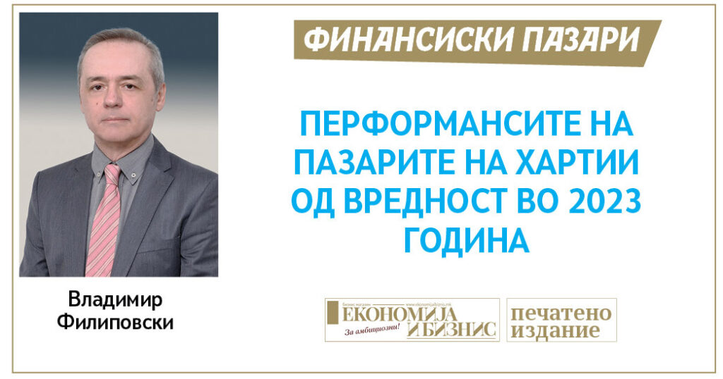 Пазарите на акции во светот во 2023 година успеаја да се опорават по стравичната 2022 година во која индексите на акции генерално беа во зоната на значајно (двоцифрено) негативни приноси. Глобалниот индекс на акции за развиените пазари, MSCI World Index1, во 2023 година остварува солиден пораст од 24,4 % со тоа компензирајќи го падот од 2022 година од -17,7 %. Овој индекс покажува дивиденден принос од 1,9 % и принос во форма: добивка по акција/пазарна цена на акција од 4,8 % (состојба на крајот на 2023 г.) – скромните перформанси на овие два индикатори се пред сè поради релативно високите нивоа на пазарните цени на акциите, а не поради ниски добивки на компаниите. Намалување на ризиците од глобална стагфлација и постепеното смирување на инфлациските притисоци, што доведе до запирање на трендот на покачување на референтните каматни стапки на централните банки, заедно со одредено опоравување на реалниот економски раст, веројатно беа некои од причините за подобрени деловни очекувања на инвеститорите и порастот на цените на акциите на развиените пазари на капитал. Во 2023 г. дојде до забележителна концентрација на пазарната капитализација во групата на т.н. „седум величествени“ американски компании2 − тие претставуваа 0,5 % од вкупниот број компании во индексот (1480), а нивната збирна капитализација беше околу 19 % од вкупната пазарна капитализација на индексот.