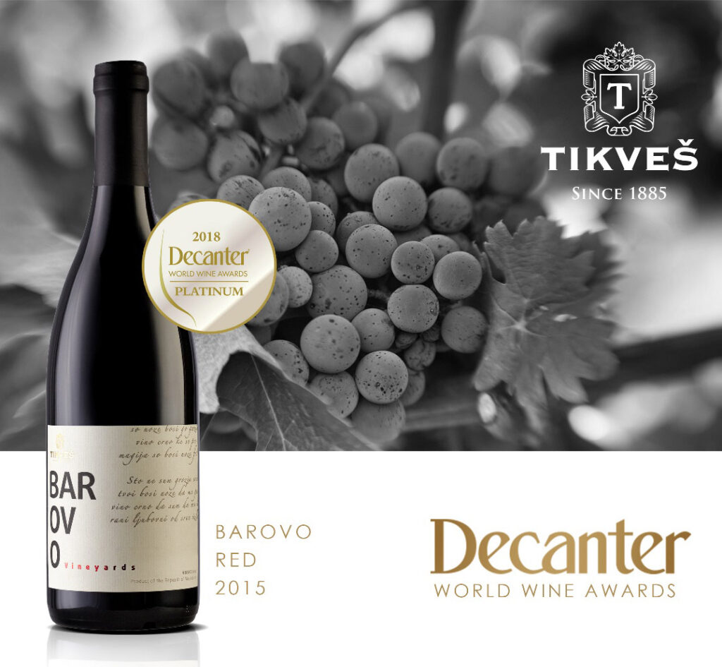 Врвното „тероар“ црвено вино „Барово“ на Винарската визба „Тиквеш“,од бербата 2015-та, е наградено со платинест медал на еден од најмасовните меѓународни вински натпревари – Decanter 2018, кој се одржува во Лондон, а на кој секоја година за престиж во винскиот свет се борат над 17.000 вина од најпознатите вински региони.