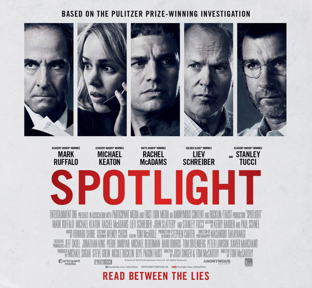 Во 2001 година онлајн медиумите се сè уште во зародиш, па така големите дневни весници и понатаму можат да си дозволат финансирање тимови од типот на „Спотлајт“ – посебна редакција за истражувачко новинарство во рамките на престижниот Бостон глоуб. Нивната истрага (наградена со Пулицер во 2003-тата година) го разобличи повеќедецениското прикривање на случаите на педофилија во пазувите на Католичката црква во спрега со највисокиот државен естаблишмент. Тоа предизвика верижен бран на разоткривања низ светот и барем за момент ја потресе до темел најмоќната религиозна институција во светот од која се очекува да има воспитно-образовна улога кај децата. „Велат дека се работи само за физичко злоставување, но е многу повеќе од тоа. Ова беше духовно злоставување. Знаете ли зошто се согласив на сè? Бидејќи мислев дека свештениците би требало да бидат добрите момци“ – изјавува една од жртвите на сексуално насилство во филмот.