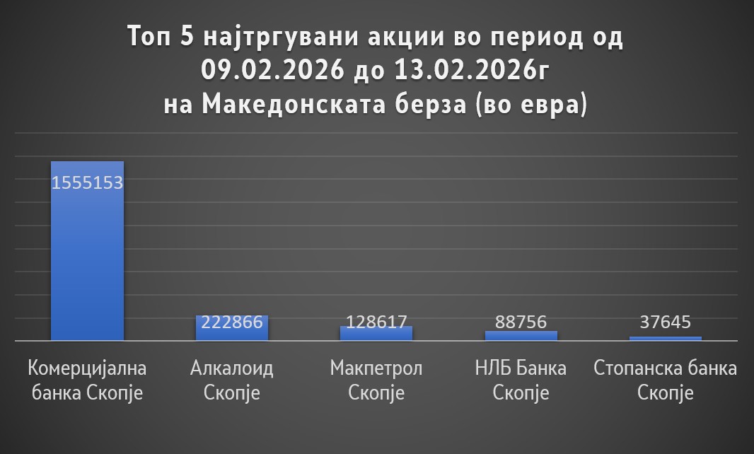 Минатата недела, во периодот од 09.02.2026 – 13.02.2026 година на Македонската берза на хартии од вредност на официјалниот пазар и на редовен пазар беше остварен вкупен промет од 132,6 милиони денари или околу 2,1 милиони евра.