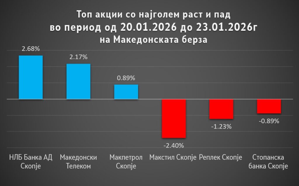 Најголеми добитници изминатата недела се имателите на акции на НЛБ Банка АД Скопје, Македонски Телеком Скопје и Макпетрол Скопје. Цената на нивните акции се зголеми за 2,68 %, 2,17 % и 0,89 %, соодветно.