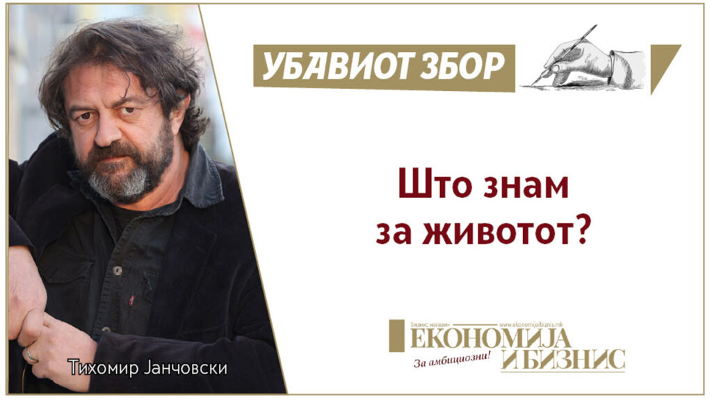За животот знам сѐ и сешто, не само по нешто, а тој за мене знае сѐ, зашто има работи што не може да ги знаеме, инаку не би постоеле. Би биле живи – мртви, зашто животот би застанал, а тој мора да врви, инаку ќе се сториме врвка. Песијазол, па животот ќе мора да нѐ учи и како да сечеме, не може сѐ да се разреши со прсти и влечење.