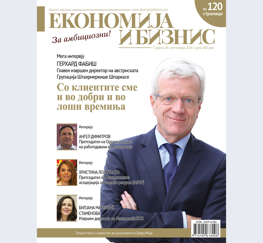 СОДРЖИНА Зоран Јовановски НАЈГОЛЕМИОТ НЕУСПЕХ НА РЕПУБЛИКА МАКЕДОНИЈА ВО ИЗМИНАТИТЕ 25 ГОДИНИ…………..14 Герхард Фабиш, Групација Штаермеркише Шпаркасе СО КЛИЕНТИТЕ СМЕ И ВО ДОБРИ И ВО ЛОШИ ВРЕМИЊА……………16 Горан Петрески КОЛКУ ПОВЕЌЕ, ТОЛКУ ПОДОБРО……………22 Тања Јакоби ТЕРОРИСТИ И ЕКОНОМИСТИ……………26 Ангел Димитров СОЦИЈАЛНИОТ ДИЈАЛОГ Е НАЈДОБАР НАЧИН ЗА РЕШАВАЊЕ НА ЕКОНОМСКО-СОЦИЈАЛНИ ПРОБЛЕМИ……………32 Игор Давков ЕУ ВАЈД СТРЕС-ТЕСТ […]