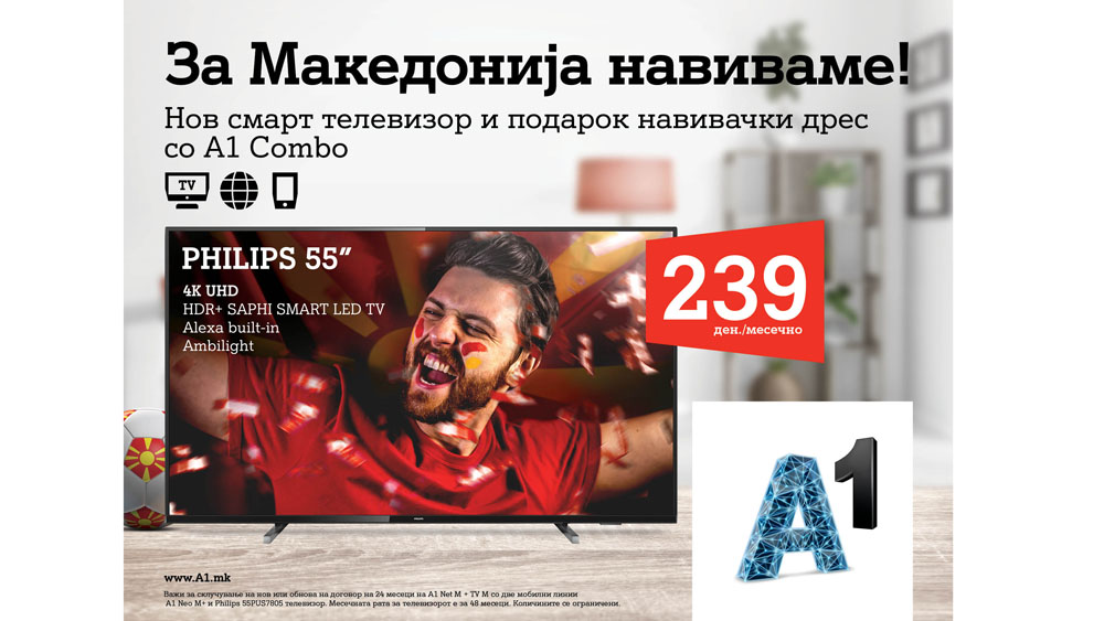 Со А1 Combo можност за нов Philips телевизор и подарок навивачки дрес Во пресрет на највозбудливото фудбалско лето со натпреварите од европското фудбалско првенство, А1 Македонија ја збогатува својата понуда и ја најавува новата промоција со зголемен мобилен интернет, уште поголем попуст за нови уреди и подарок навивачки дрес за опуштено следење на најголемиот спортски […]