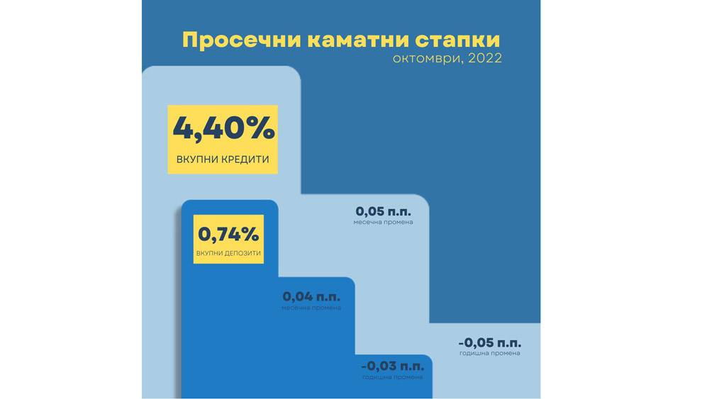 Месечно зголемување на просечната каматна стапка на вкупните кредити, при што во октомври таа изнесува 4,40%. Слична динамика и кај просечната каматна стапка на вкупните депозити, којашто изнесува 0,74%. Најновото соопштение за позначајните движења кај каматните стапки на банките и штедилниците е достапно на следната врска: http://www.nbrm.mk/soopstenija-ks-ns_article-kamatni-stapki.nspx