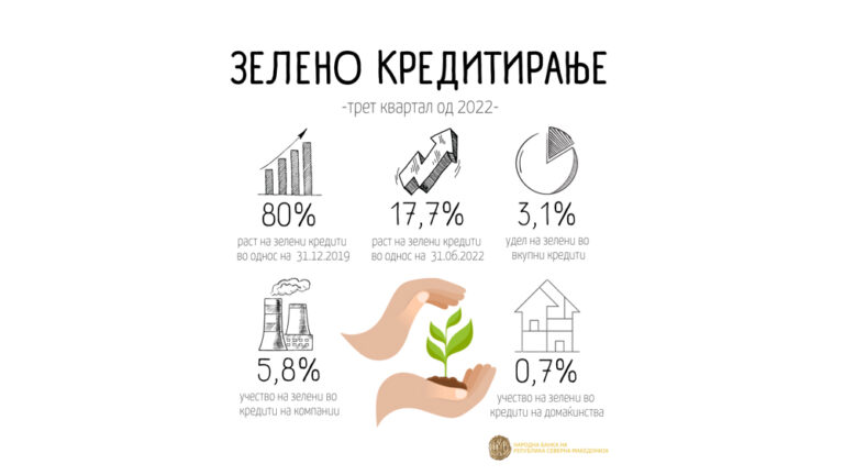 Забрзува растот на зеленото кредитирање во третиот квартал од 2022 година, достигнувајќи 17,7%%. Зелените кредити се наменети за проекти коишто поддржуваат одржливи, еколошки цели, или цели коишто придонесуваат за зелената