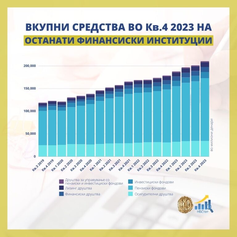 Во четвртиот квартал на 2023 година, вкупните средства на останатите финансиски институции изнесуваат 210.604 милиони денари, што претставува квартално зголемување од 9.295 милиони денари. Останатите финансиски институции учествуваат со 19,6%
