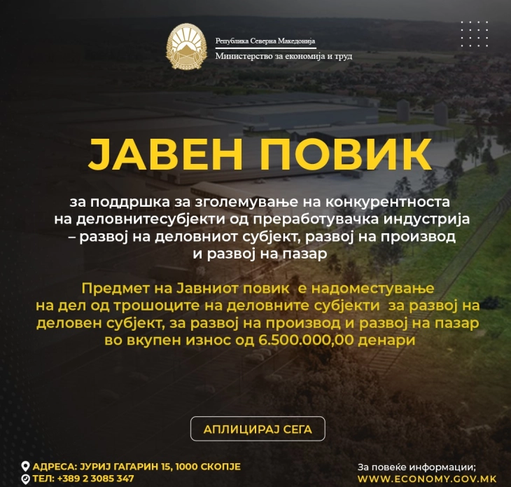 ОБЈАВЕН ПОВИК ЗА ФИНАНСИСКА ПОМОШ ЗА ПРЕРАБОТУВАЧКАТА ИНДУСТРИЈА, финансиска поддршка за зголемување на конкурентноста кај компаниите и за опремување на лабаратории