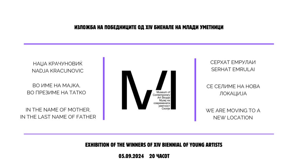 На 5 септември, во 20 часот, во Музејот на современата уметност – Скопје ќе бидат отворени самостојни изложби на младите уметници, Серхат Емрулаи и Наџа Крачуновиќ, добитници на наградата „Најуспешен автор и дело“, која им беше доделена минатата година на 14.Меѓународно биенале на млади уметници – „Будења“. Куратори на изложбите се Ива Димовски, Бојана Јанева […]