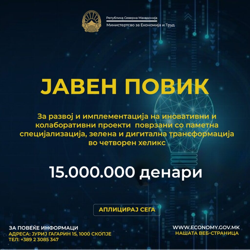 Министерството за економија и труд објави Јавен повик за кофинансирање на проекти за паметна специјализација, зелена и дигитална трансформација, обезбедени 15.000.000 денари