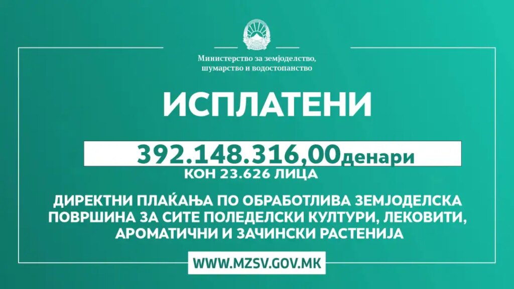 Кон 32.798 земјоделци денеска се исплатени 625.043.081 денари субвенции за растително производство од Програмата за финансиска поддршка за земјоделството за 2024 година, информираат од Министерството за земјоделство, шумарство и водостопанство. Оттаму додаваат дека продолжува тековната исплата на финансиска поддршка и денеска кон земјоделците. – Плаќањето се изврши кон 23.626 корисници во износ од 392.148.316 денари […]