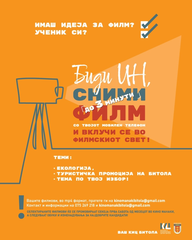ЈОУ Културен и информативен центар Битола со нова креативна иницијатива ги анимира младите битолчани од основните и средни училишта преку создавање кратки филмови да ја искажат својата креатива идеја. Пред идните сниматели, режисери и сценаристи или актери поставен е предизвик да снимат краток филм со времетраење до 3 минути, користејќи се со мобилен телефон, на […]