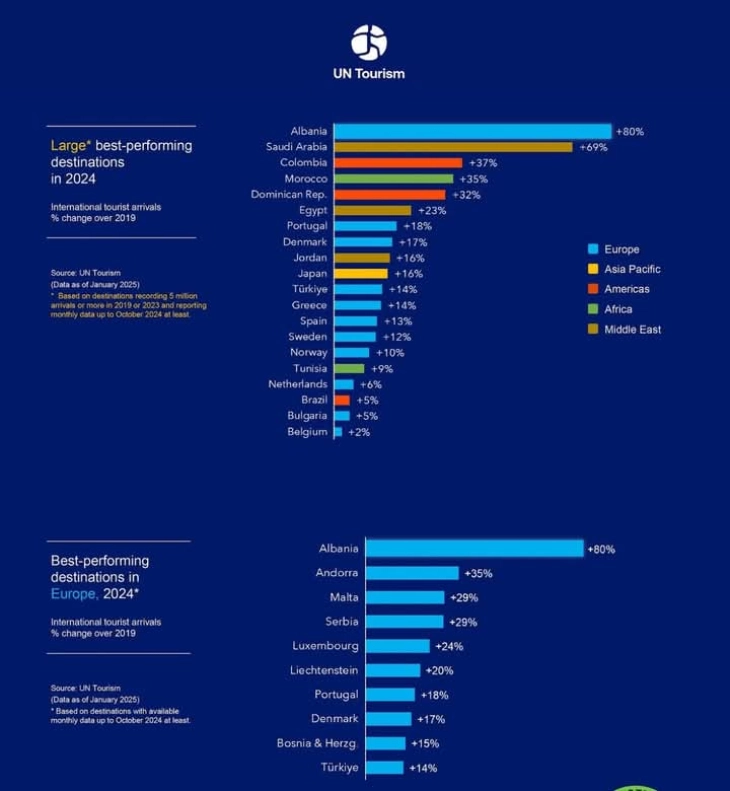 Светскиот туристички барометар покажува дека класичните дестинации за летен одмор како Шпанија, Грција и Турција привлекуваат најмногу туристи, но кога станува збор за највисок процентуален раст на туристи во последните пет години, преовладуваат други дестинации, а Албанија е на прво место. Информацијата преку социјалните мрежи ја сподели премиерот Еди Рама, објавувајќи ја табелата и најавувајќи […]