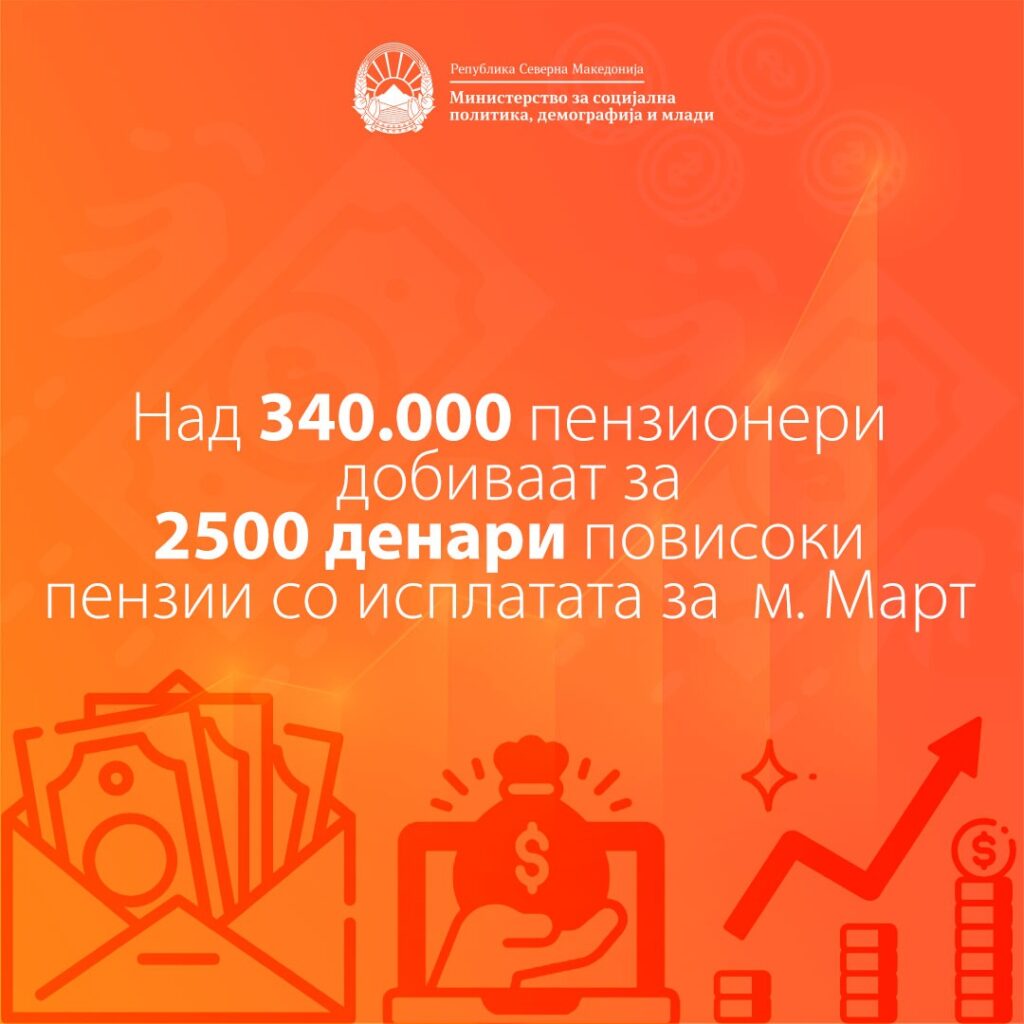 Над 340.000 пензионери во Република Северна Македонија од денес ќе добиваат за 2500 денари повисока пензија. Со линеарното покачување на пензиите во месец Септември и мартовската пензија во месец Април, пензионерите добиваат за 5000 денари повисоки пензии за само 9 месеци мандат од оваа Влада. Покачувањето на пензиите беше едно од предизборните ветувања на оваа […]