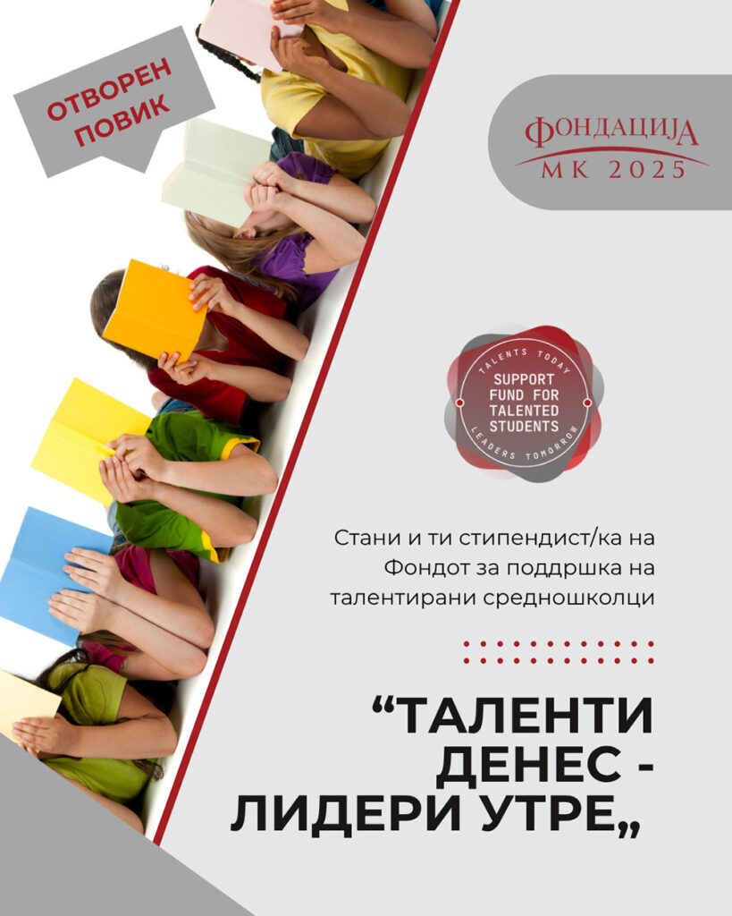 Фондацијата МК2025 го објавува повикот за прием на апликации за стипендии во склоп на Фондот за поддршка на талентирани средношколци “Таленти денес – лидери утре„ за тековната 2025/2026 година. По успешниот пилот-проект во 2019 година, Фондацијата МК2025 континуирано обезбедува средства за финансиска поддршка на талентирани млади од Македонија. Преку овој фонд, и и оваа година […]