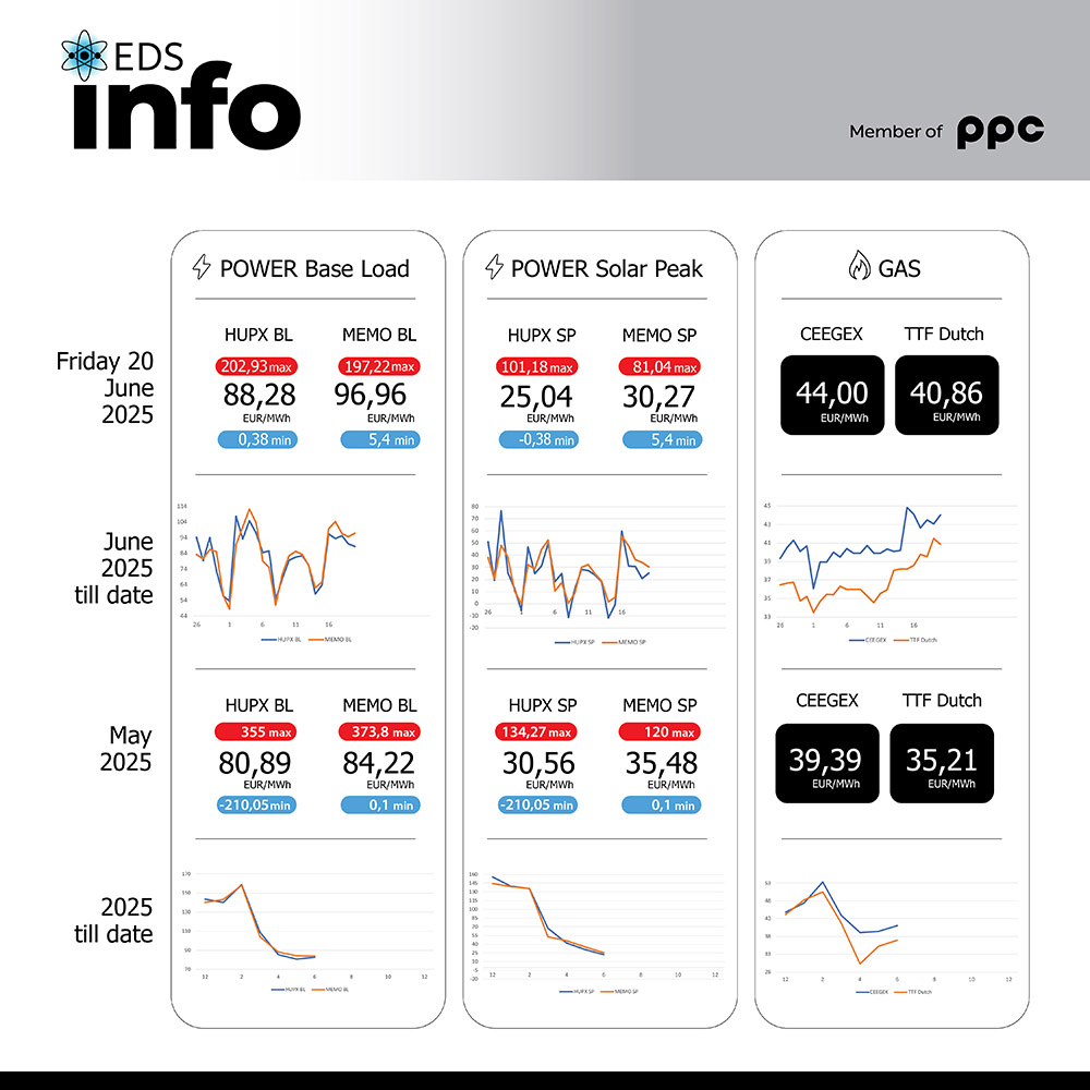 ЕДС Инфо поинт: Просечната цена на струјата на HUPX берзата за петок 20.06.2025 изнесува 88,28 евра за мегават час, на МЕМО 96,96 евра за мегават час