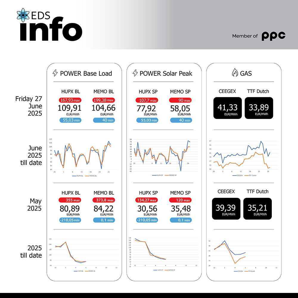 ЕДС Инфо поинт: Просечната цена на струјата на HUPX берзата за петок 27.06.2025 изнесува 109,91 евра за мегават час, на МЕМО 104,66 евра за мегават час