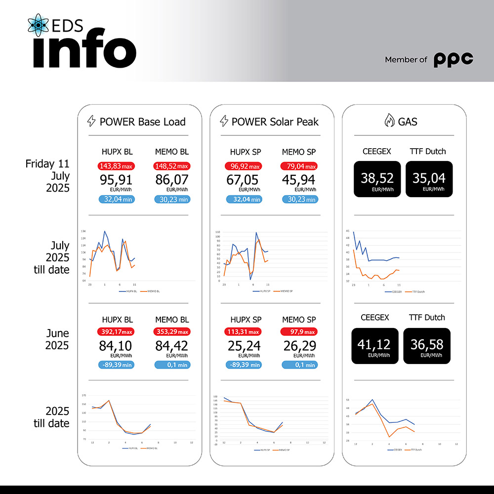 Согласно податоците за движењето на цените на берзата HUPX во Унгарија за 11 јули просечната часовна цена на еден мегават час електрична енергија (baseload) изнесува 95,91 евра/mwh, додека на Македонската берза за електрична енергија цената е 86,07 евра/mwh Цената на електричната енергија во текот на дневните часови (9:00 – 15:00) (Power solar peak) на HUPX […]
