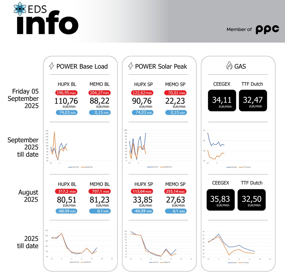Согласно податоците за движењето на цените на берзата HUPX во Унгарија за 05 септември просечната часовна цена на еден мегават час електрична енергија (baseload) изнесува 110,76 евра/mwh, додека на Македонската берза за електрична енергија цената е 88,22 евра/mwh Цената на електричната енергија во текот на дневните часови (9:00 – 15:00) (Power solar peak) на HUPX […]