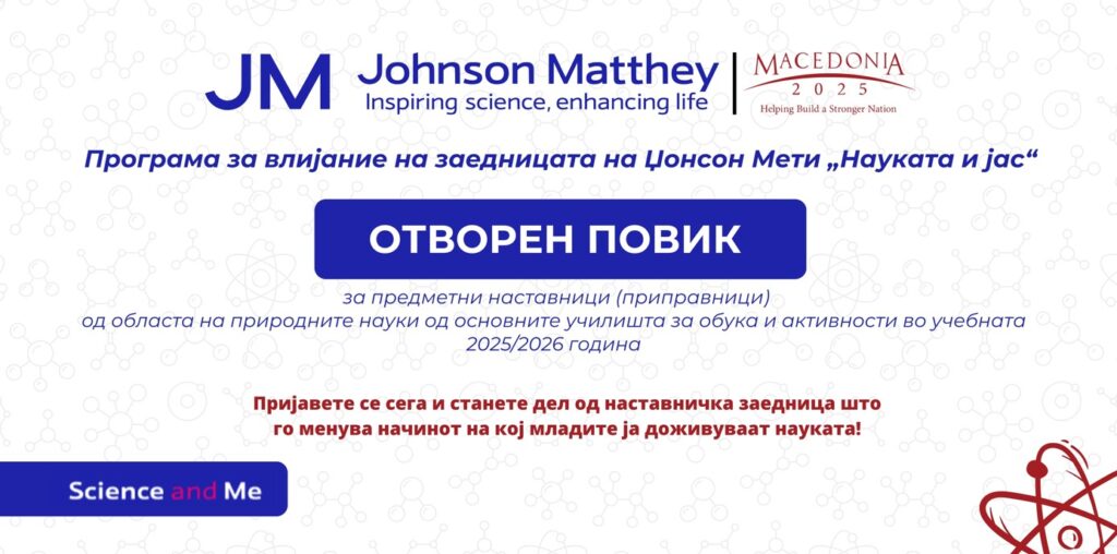 Македонија2025, во рамки на Џонсон Мети Програмата за поддршка на заедницата„Науката и Јас“, го објавува новиот повик за предметни наставници по природни науки (природни науки, биологија, хемија, физика) од основните училишта во земјата. Повикот е отворен до 20 октомври 2025 година. Кој може да аплицира? – Наставници приправници по природни науки од основните училишта – […]
