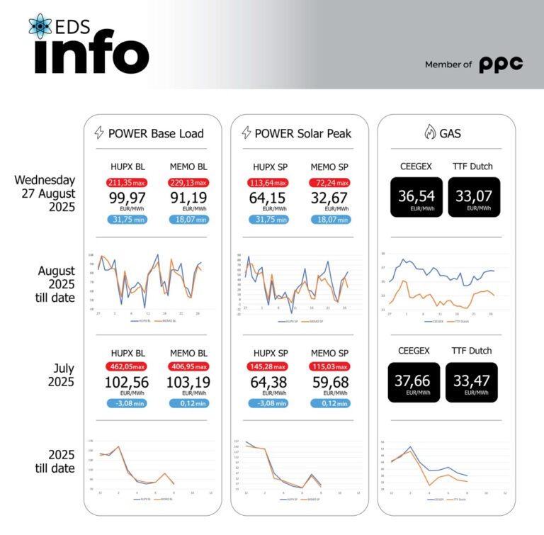 ЕДС Инфо поинт: Просечната цена на струјата на HUPX берзата за среда 27.08.2025 изнесува 99,97 евра за мегават час, на МЕМО 91,19 евра за мегават час