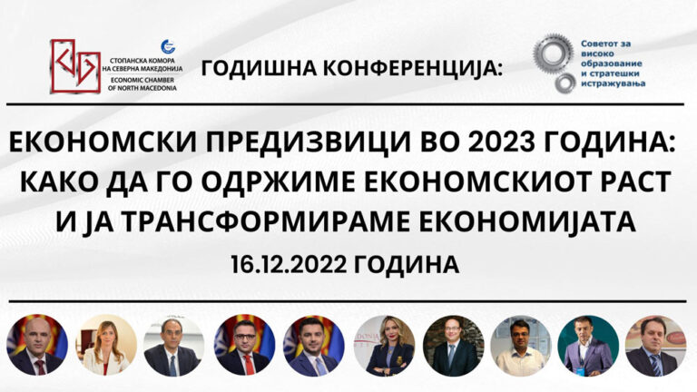 Советот за унапредување на високото образование и стратешки истражувања организира годишна конференција на 16.12.2022 година (петок) на тема: „Економски предизвици во 2023: како да го одржиме економскиот раст и ја