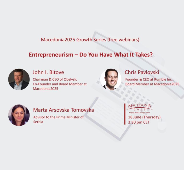 Македонија2025 организира ексклузивен вебинар насловен „Претприемништво – Дали го имате она што е потребно за успех?“ (Entrepreneurism – Do You Have What It Takes?), кој ќе се одржи во четврток