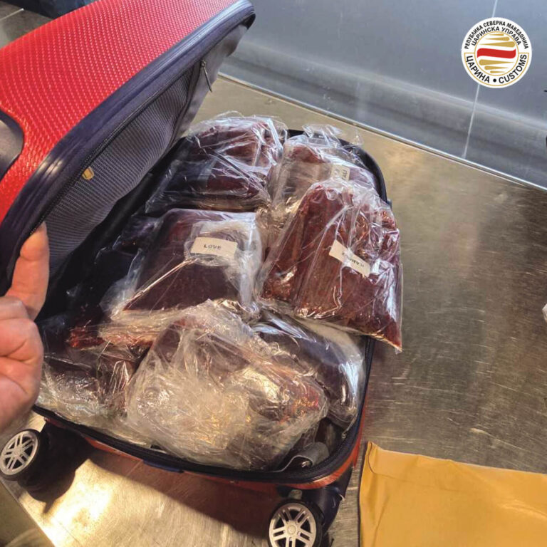 Мобилен царински тим на граничен премин Меѓународен Аеродром Скопје, на влез во државата, спречи обид за шверц на дури 27,5 килограми ароматизиран тутун за наргиле, што требало да заврши на