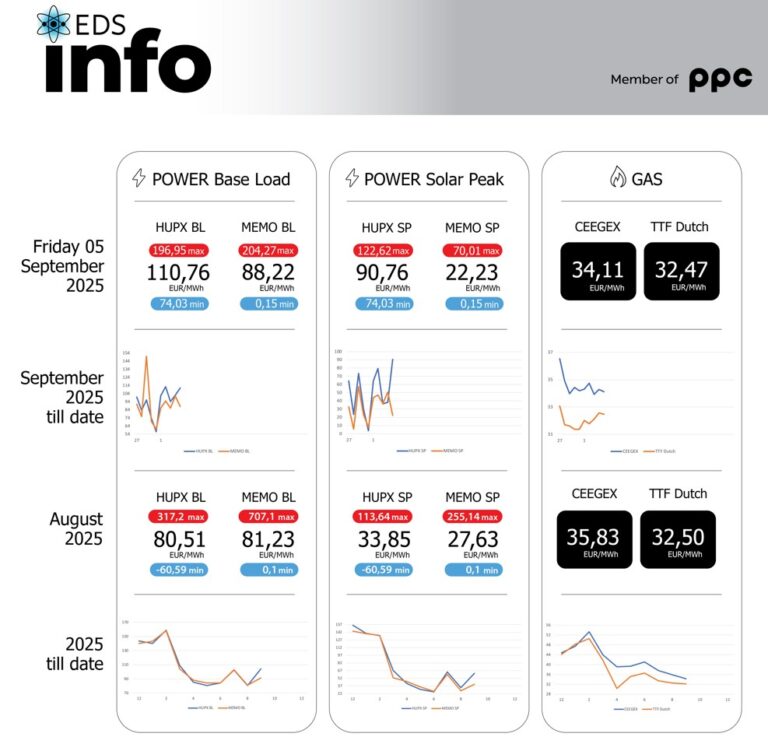 Согласно податоците за движењето на цените на берзата HUPX во Унгарија за 05 септември просечната часовна цена на еден мегават час електрична енергија (baseload) изнесува 110,76 евра/mwh, додека на Македонската