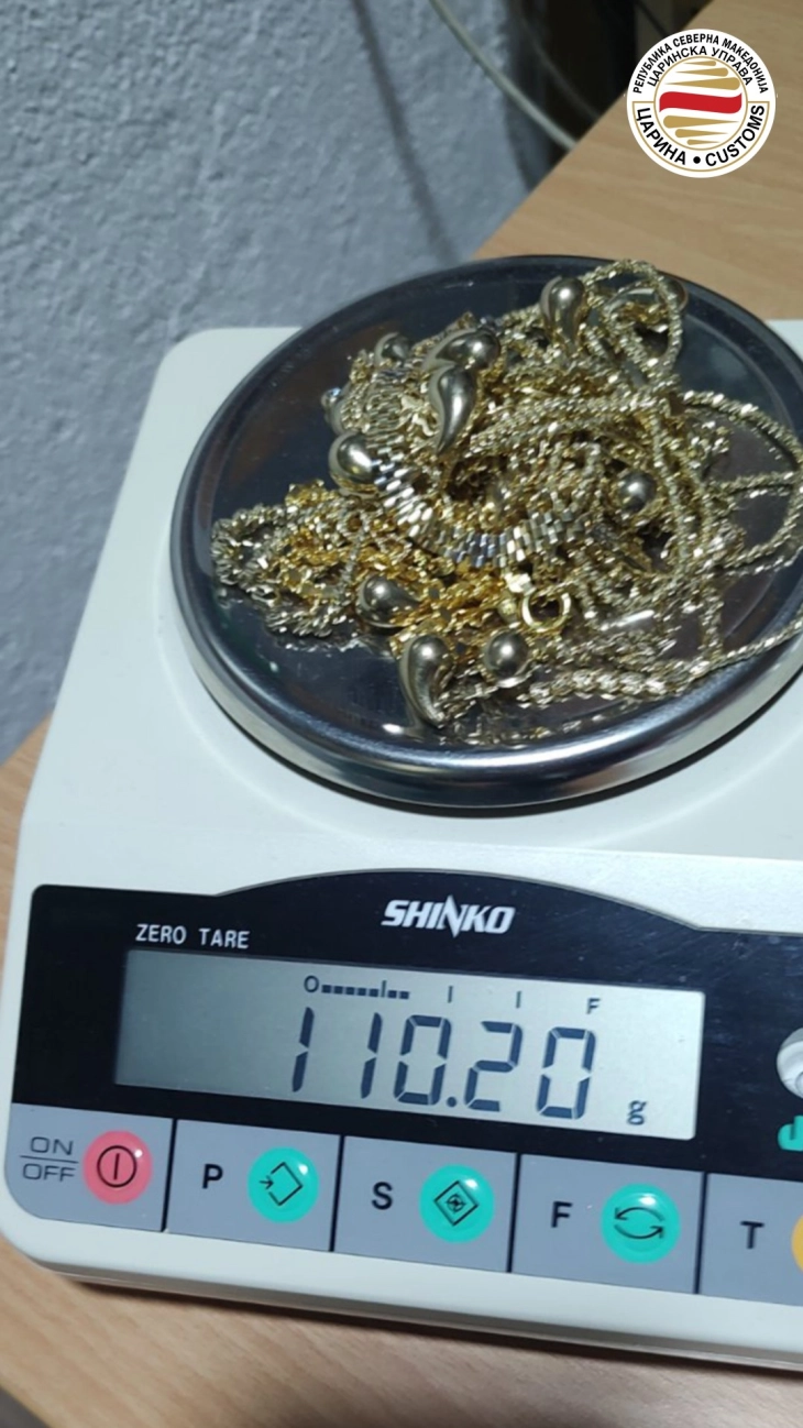Царинските службеници на граничниот премин Богородица запленија 110,2 грама златен накит и 1,7 килограми сребрен накит со вкупна вредност од 563.735 денари, откриени кај еден патник кој патувал на релација