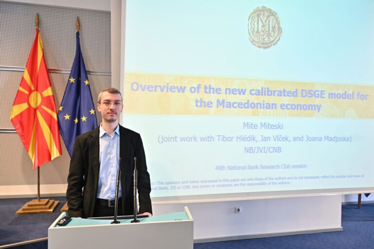 Во Народната банка се одржа 49. сесија на Клубот на истражувачите на која беше претставен научниот труд „Преглед на новиот калибриран модел на ДСГЕ за македонската економија“ од авторите Тибор